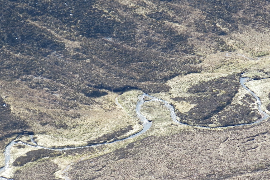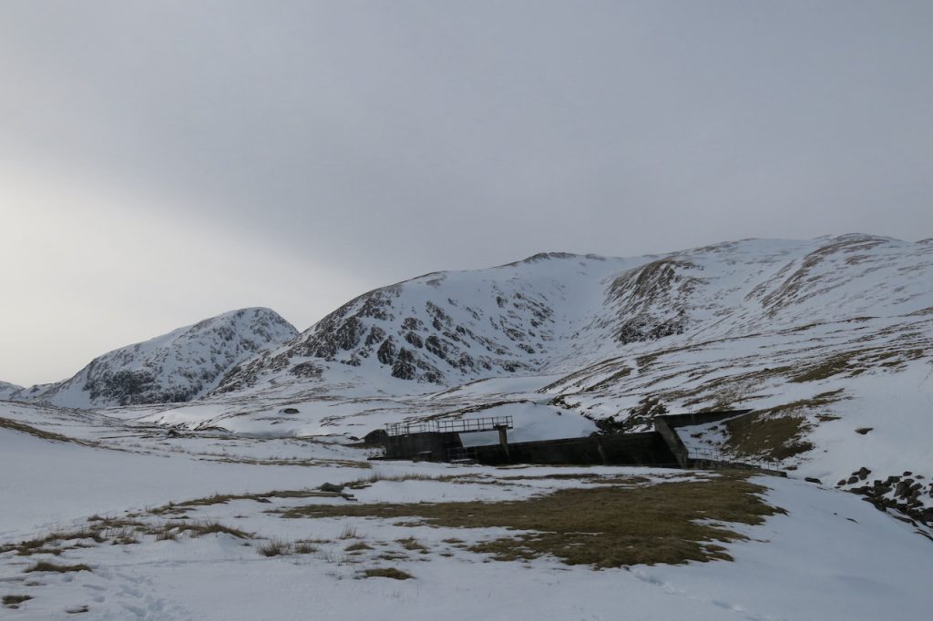It was with some trepidation that we descended, because we almost certainly had to cross the Lawers Burn. We had memories of wading across this in 2004 when it was in spate. Again. we approached it below the small dam. This time however the snow in the hills had not melted and there was a small trickle of water.