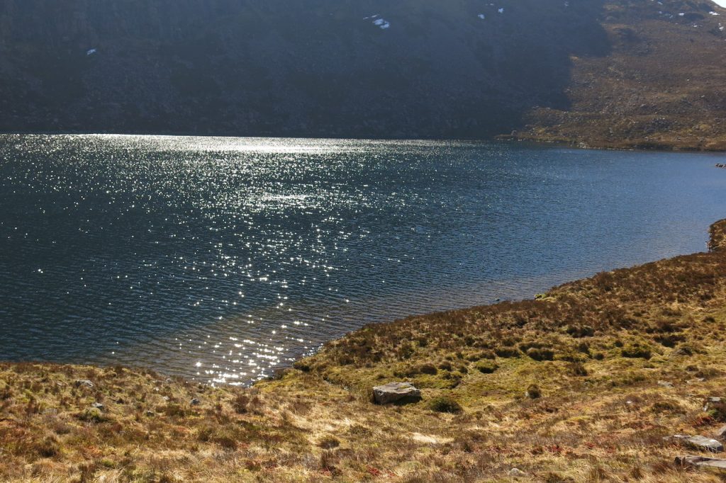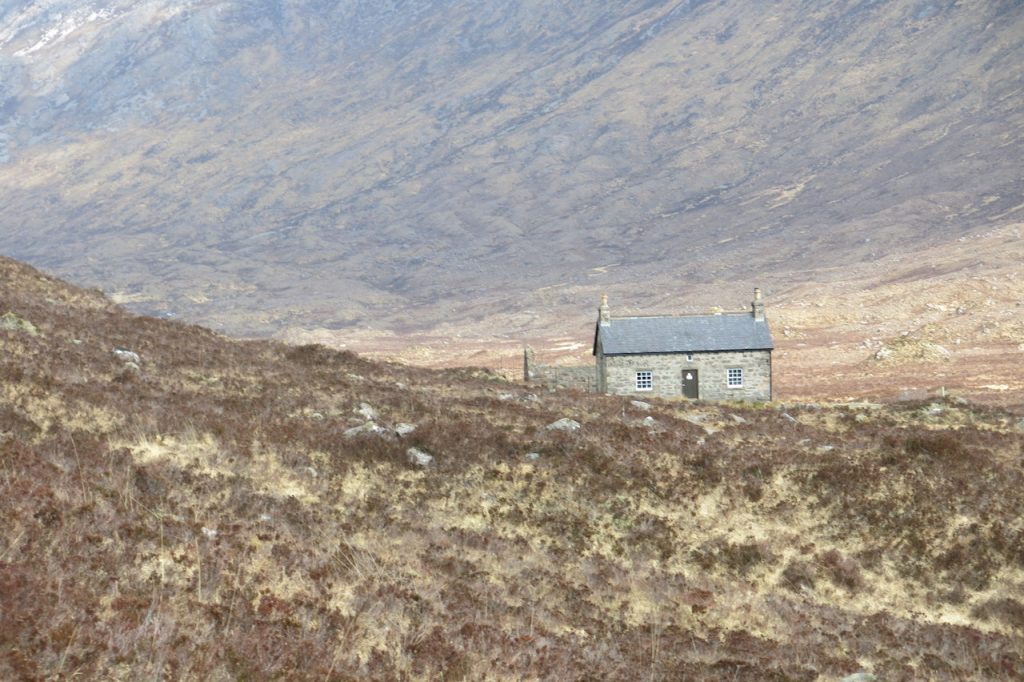 We followed a track through a sheep farm to the Coire Fionnaraich bothy. Ate lunch at a sheltered spot above Loch coire an Ruadh StoicThe sun glittered on the dark blue water. there was a good view of Bein Demph.