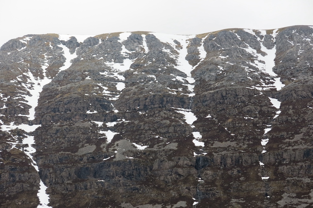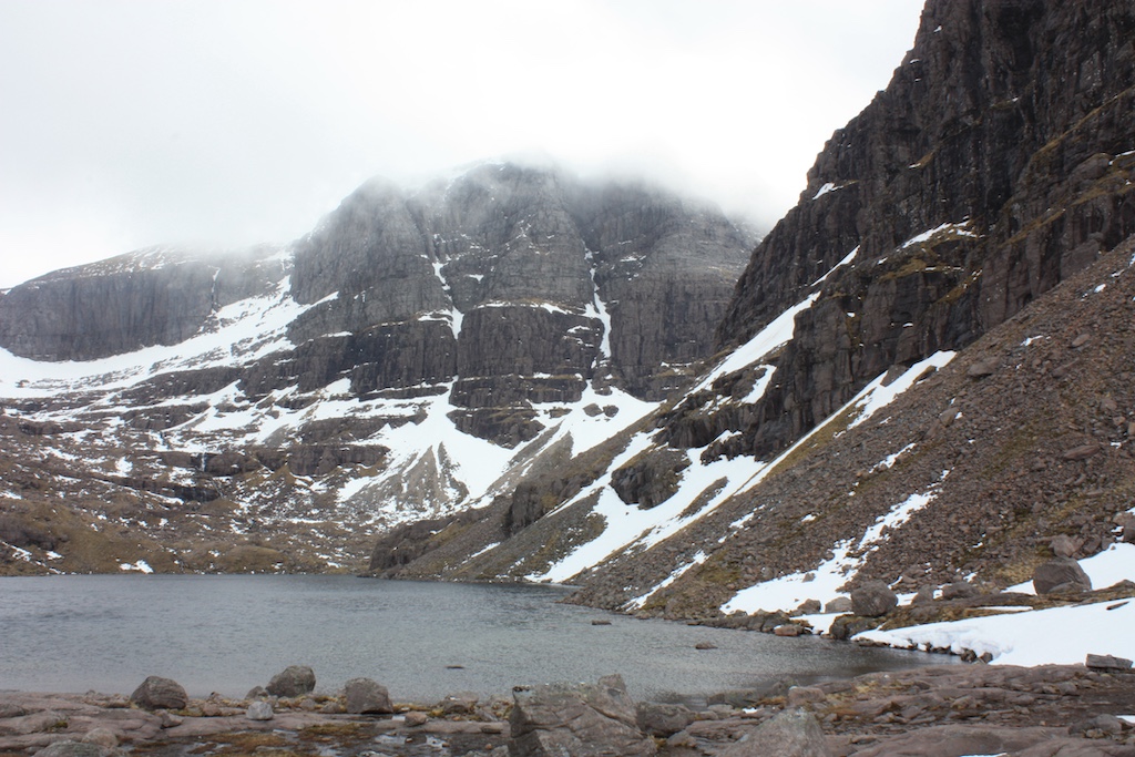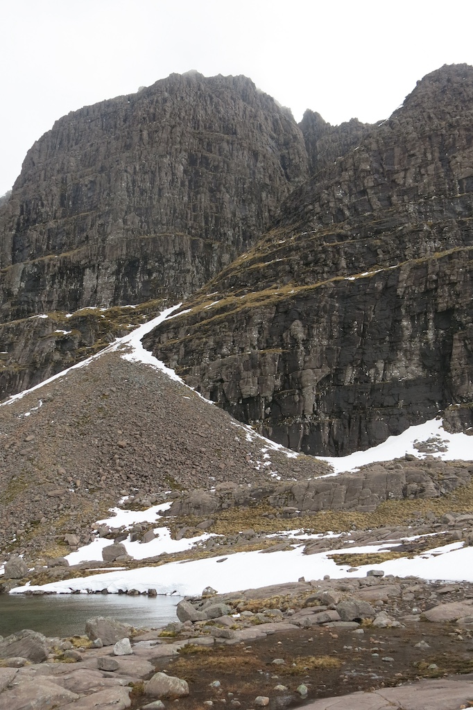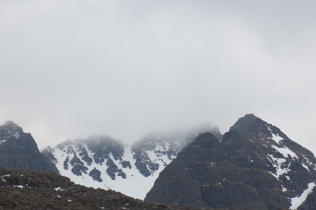 Occasionally Liathach was visible in full splendour. We walked around the end of Sail Mhor to Loch Coire Mhic Fhearchair. Great waterfalls, frozen spray, Wind blowing steadily.