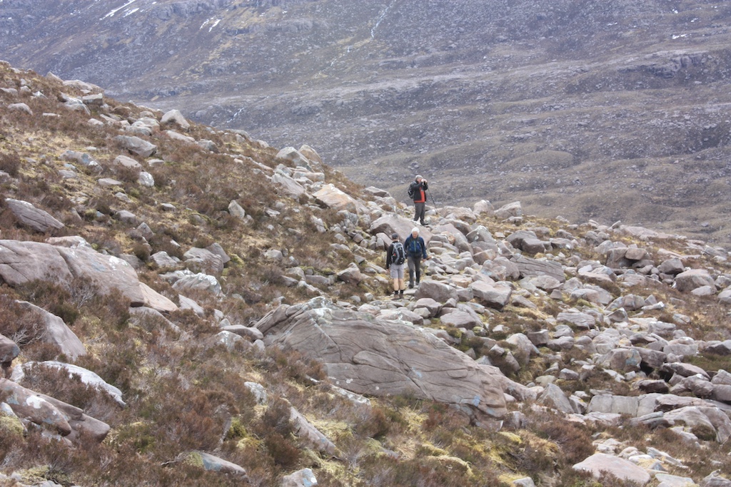 Sunny. This was to be one of those splendid days that we will remember forever. No summits climbed, but a super walk in the Coulags with Dave Campbell and his daughter, Jenny. We chose a circuit of Meol Chean-dearg (aka MCD), a route mentioned on the Walkhighlands website.