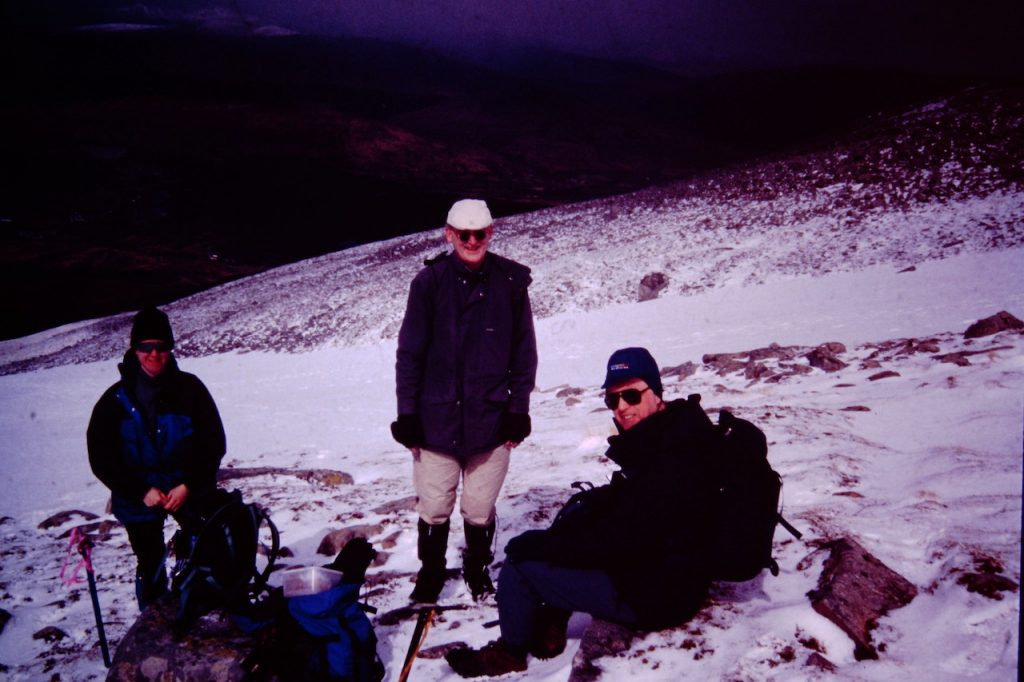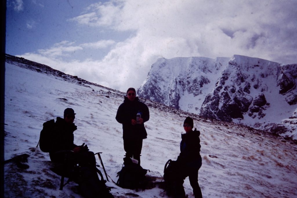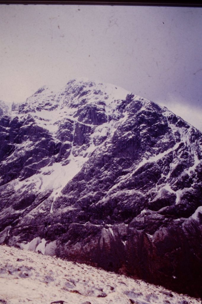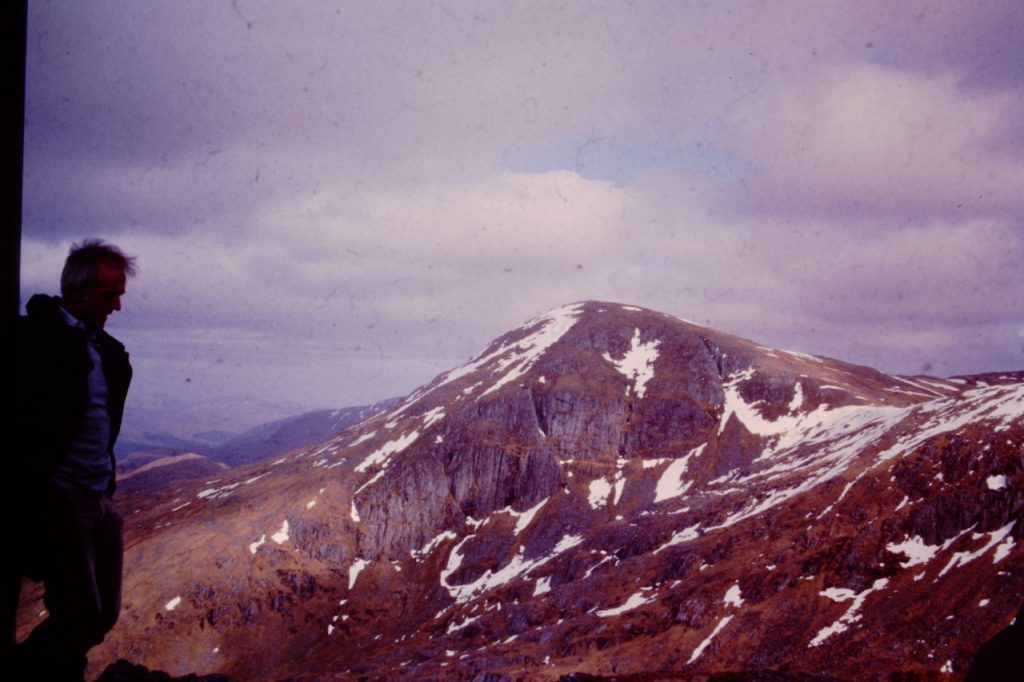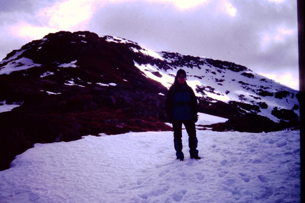 There was an abortive attempt at Càrn Mòr Dearg from near Inverlochy. It resulted in Betsy and I being left behind and me giving Phil a dressing down for forgetting us. I feel bad about that, but he doesn’t seem to be scarred by it. That whole day was a disaster. Betsy’s crampons fell apart on a massive ice sheet. We ran into Dave Kee and Bob Muir around there and stayed with them. Dave and Bob had somehow also separated from the main party. They had reached a high point and scratched a message for the others in the snow. The four of us retired to the Inverlochy hotel for tea and cakes; very classy in among the Mercedes, Bentley and Rolls-Royce owners. Our dirty boots and hiking clothes lowered the tone of the place I’m sure. In the end nobody reached a summit on that day.