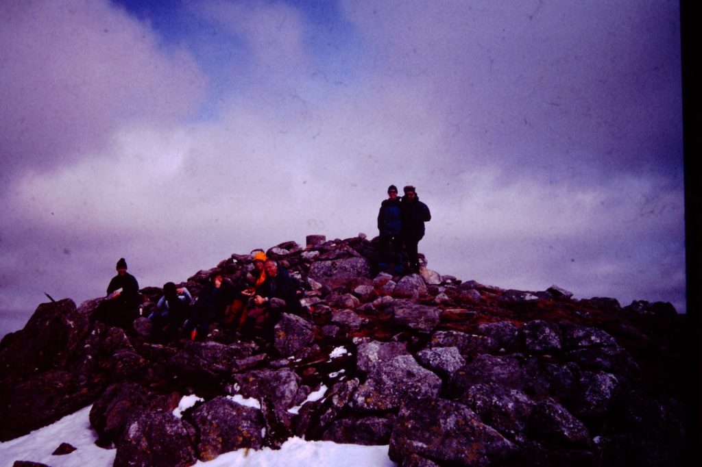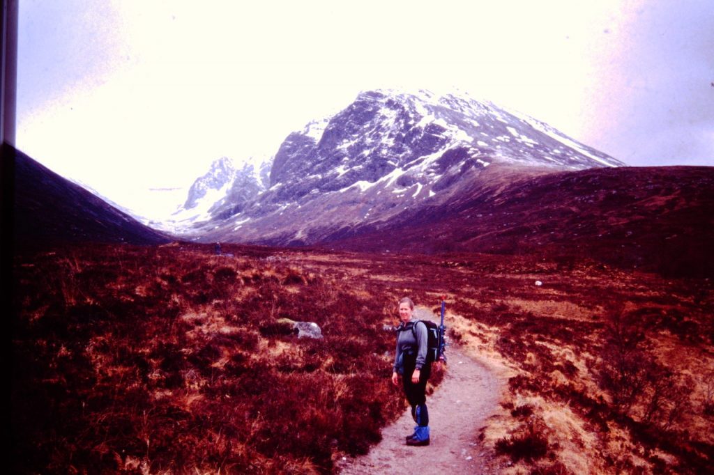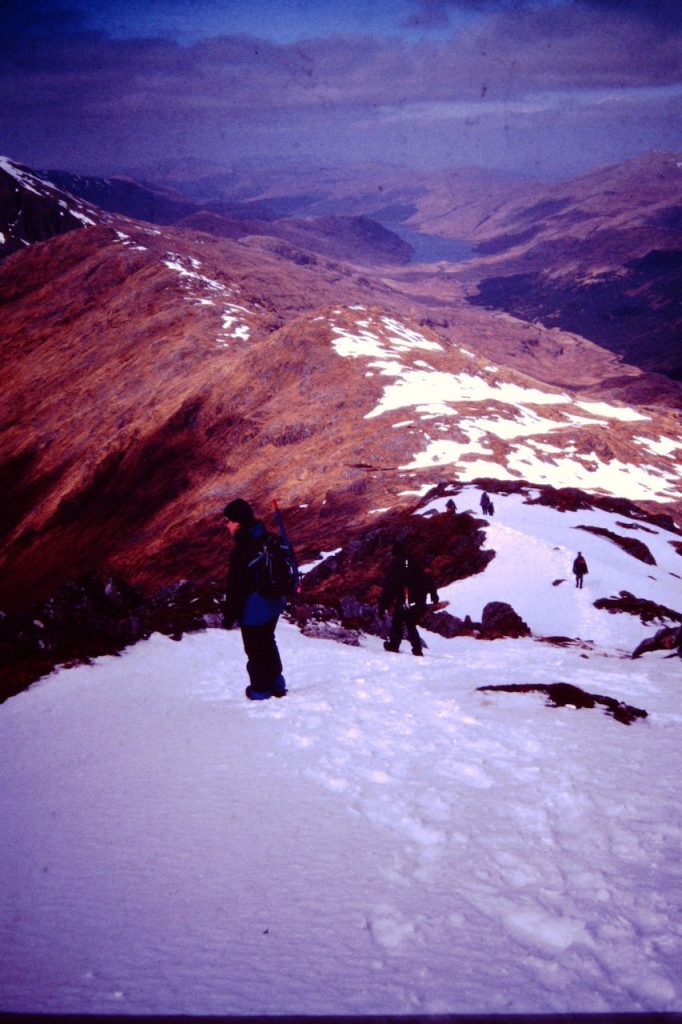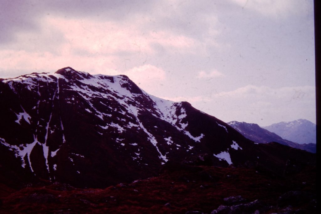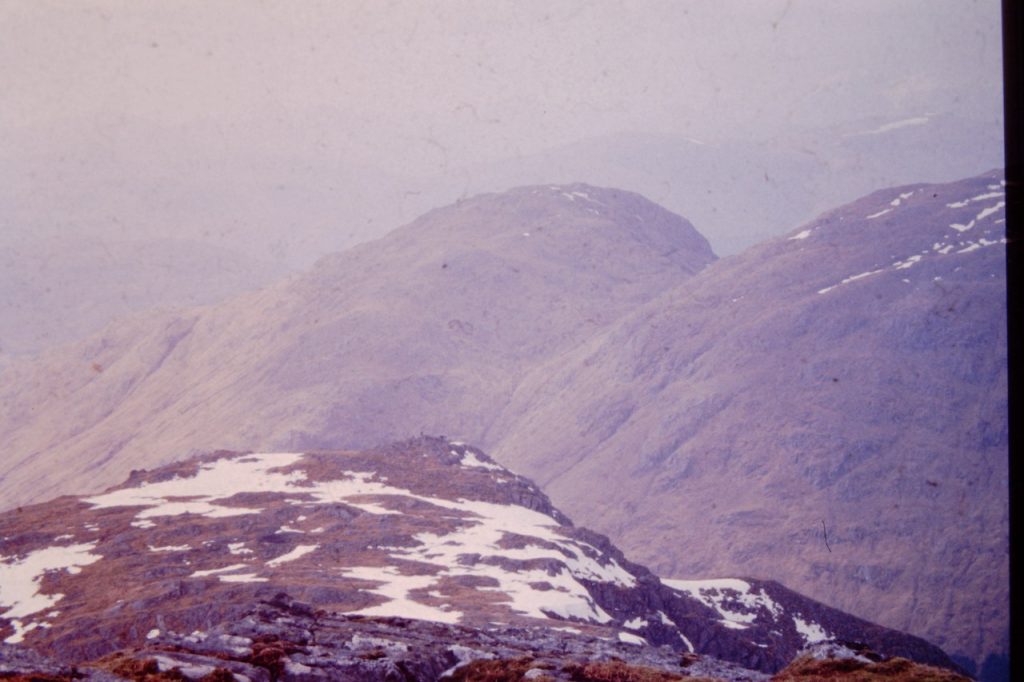 There was an abortive attempt at Càrn Mòr Dearg from near Inverlochy. It resulted in Betsy and I being left behind and me giving Phil a dressing down for forgetting us. I feel bad about that, but he doesn’t seem to be scarred by it. That whole day was a disaster. Betsy’s crampons fell apart on a massive ice sheet. We ran into Dave Kee and Bob Muir around there and stayed with them. Dave and Bob had somehow also separated from the main party. They had reached a high point and scratched a message for the others in the snow. The four of us retired to the Inverlochy hotel for tea and cakes; very classy in among the Mercedes, Bentley and Rolls-Royce owners. Our dirty boots and hiking clothes lowered the tone of the place I’m sure. In the end nobody reached a summit on that day.