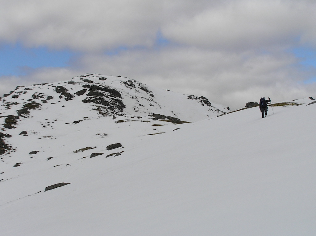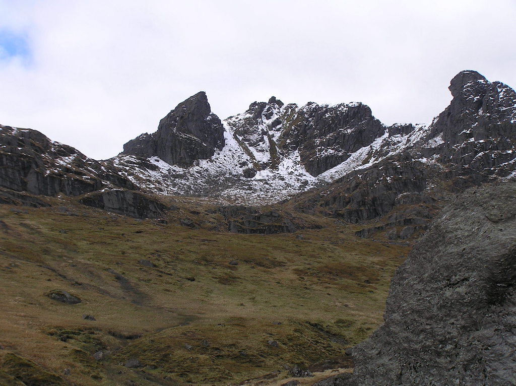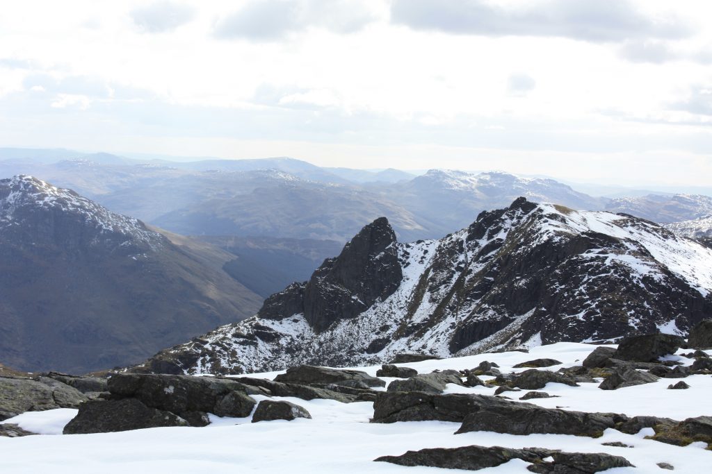 The snow had obscured the path, but a party ahead of us and cossed snow covered grass on an exposed slope. It looked very dangerous and none of us wanted to repeat this route, we regrouped, climbed higher away from exposure, found the path again then continued to the base of the summit rocks. It was now 3:30 pm and we needed time to get down, so we decided to retreat. Also cloud was coming in and temperature dropping. Best to wait or another day.