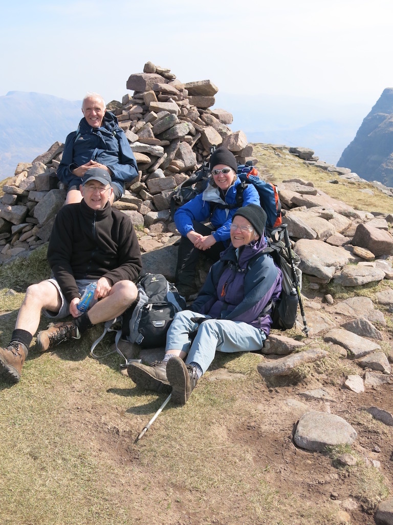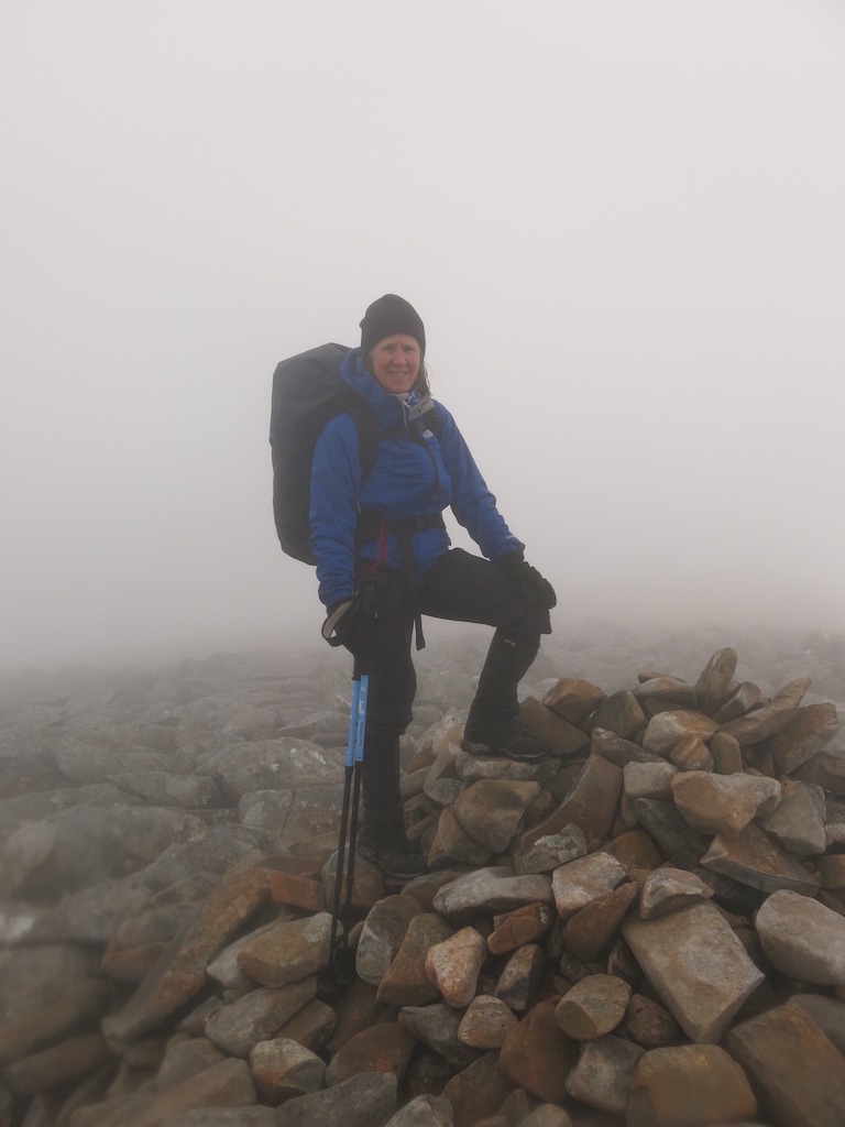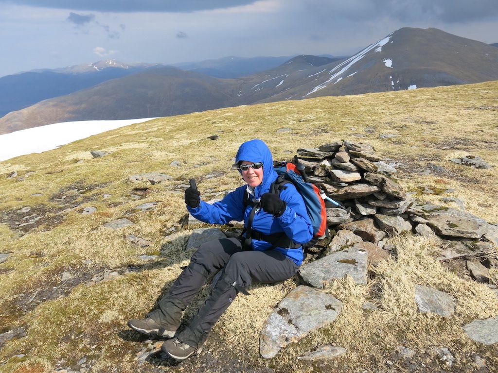 Friday 25 April: Another Munro. Cona’ Mheall a bit of unfinished business from a previous year – we had climbed all its immediate neighbours. A sunny start turned to cloud and fog as we drove south to the trailhead. It’s a long walk up a logging road to a beallach. At that point the fog was so thick that we following the path became difficult, but with the help of the OS map an compass we made progress. We ate lunch after passing some lochans and some snow patches. Two hikers came out of the mist. They had already climbed Beinn Dearg and Cona Mheall We joked about the wonderful view. We located the end of the dry stone wall from Beinn Dearg which was a good landmark and from there were were able to find our way to the summit cairn, Another Munro; 7 this year – a very good tally.