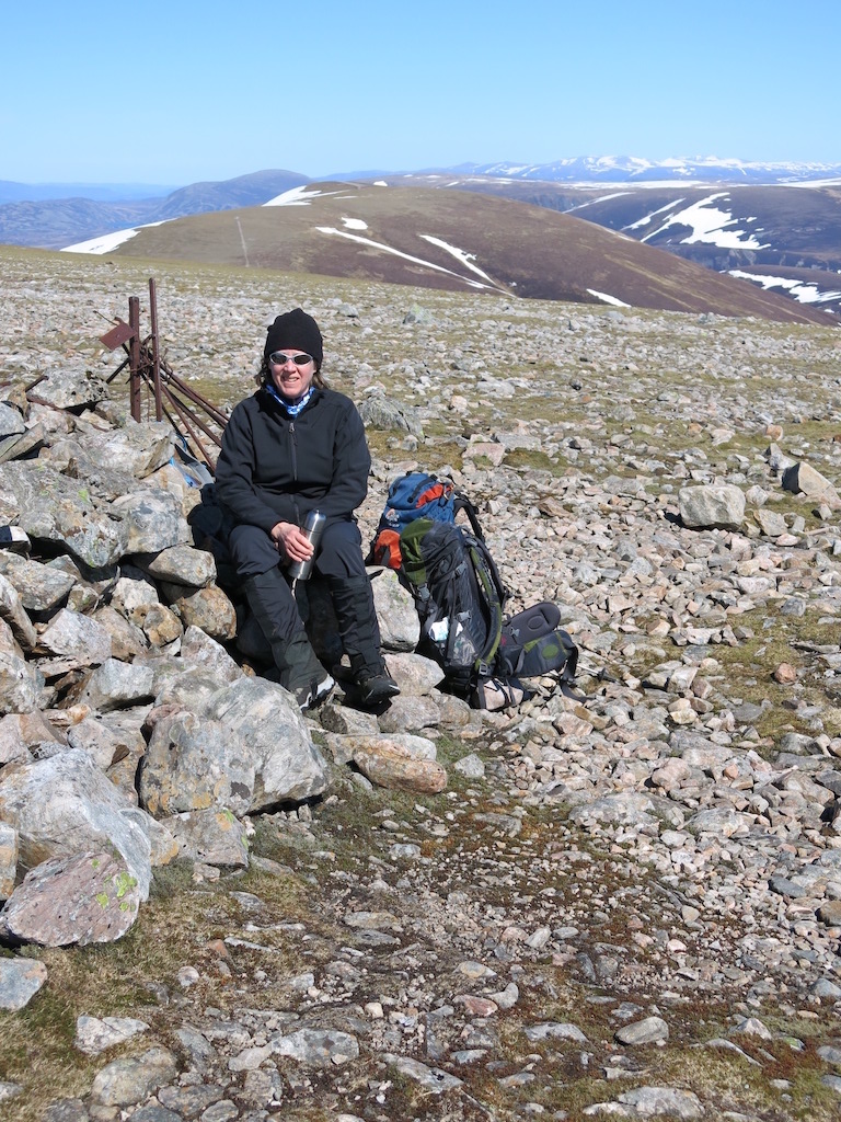 A couple of other parties arrived. There were panoramic views all round. We had tea and Mars bars before following old fence posts (the border between Perthshire and Invernesshire) towards the bealach below A’ Mharconaich where we turned right to descend grassy slppes back to the Land Rover track and on to the car. The weather made up for yesterday. Excellent. Two more Munros in great conditions, what more could we want! Some sunburn too…