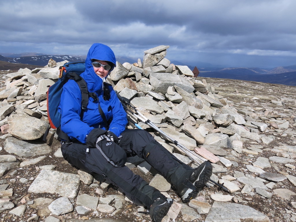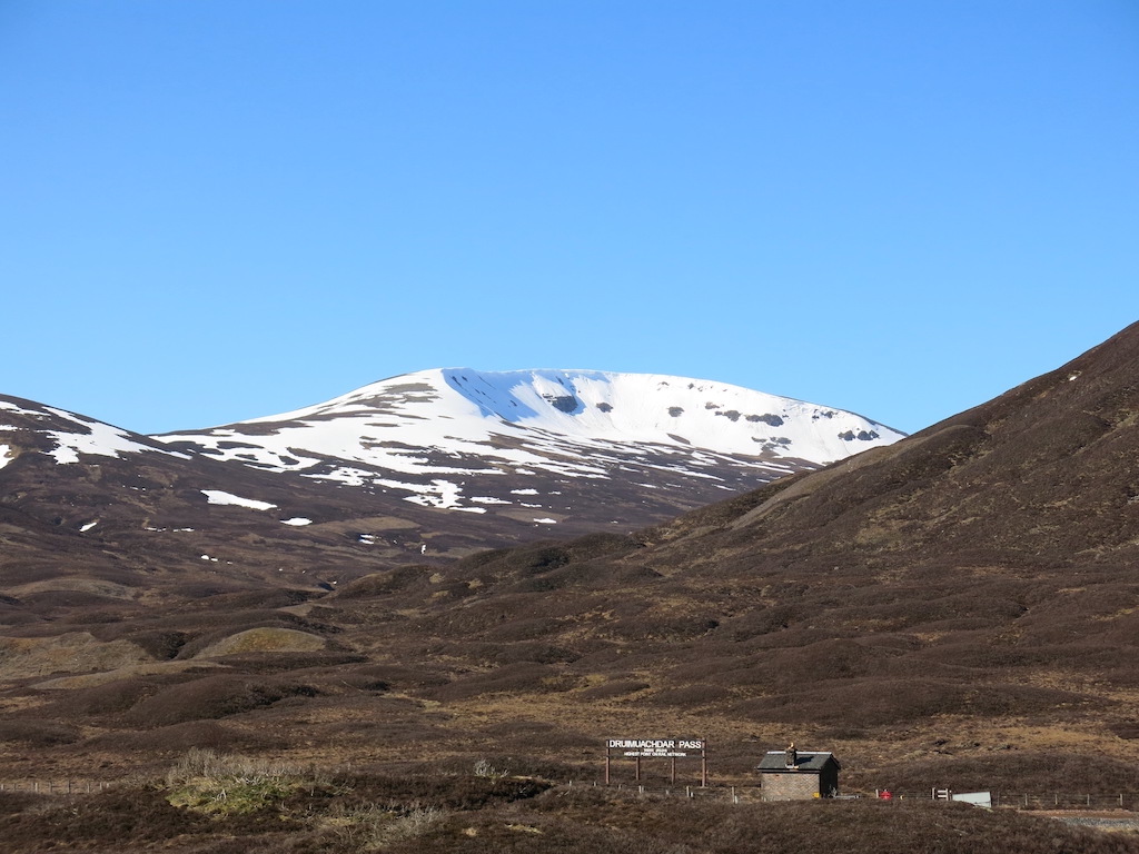 We set our eyes on Geal Charn and A’ Mharconaich first. It was Maundy Thursday and we had two full days in the region. The weather was wet. There were showers as we drove north along the A9 to Drumochter Pass, but it had stopped when we reached the Balsporran Cottages and the start of the walk. The route follows a Land Rover track up the east ridge of Geal Charn. There are two old cairns and at that point the route is a walk up grassy slopes to the summit where is was very windy and we had a bite to eat, but the wind stopped us from staying long enough to eat more than a morsel.