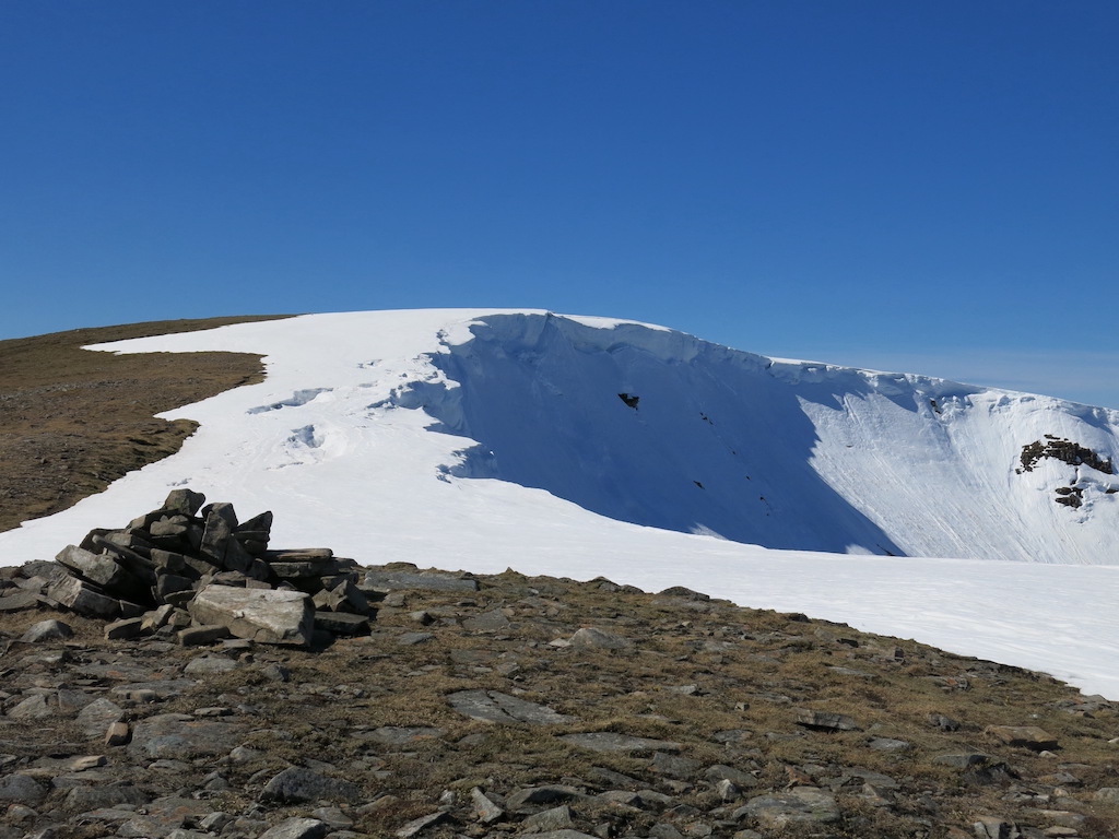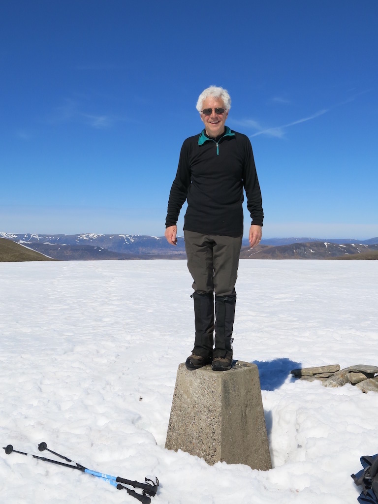 Good Friday 18 April. Another day, another Munro! We were off to Drumochter again. Our targets were Sgàirneach Mhòr and Beinn Udlamain. Today it was cloudless with sunshine. We followed the good track up to Coire Dhomain and followed clear boot tracks toward Sgàirneach Mhòr. There were big snowfields to cross and spectacular cornices on the north side of the summit plateau. The trig point was almost buried in snow. A family of Dad, three kinds and 2 dogs fro Edinburgh were there. This was Gordon’s 100th Munro and they joined in the congratulations.