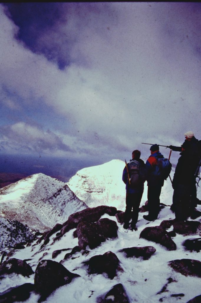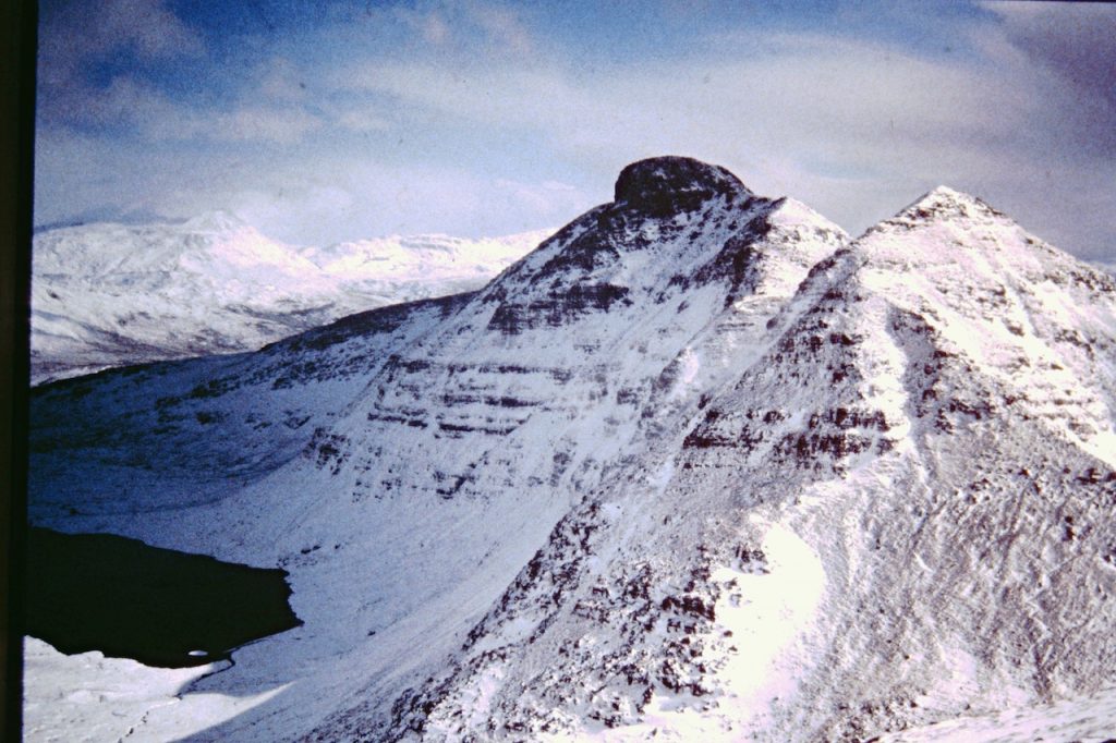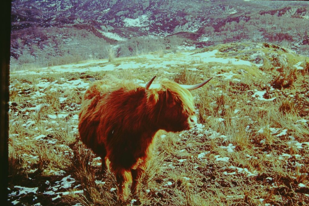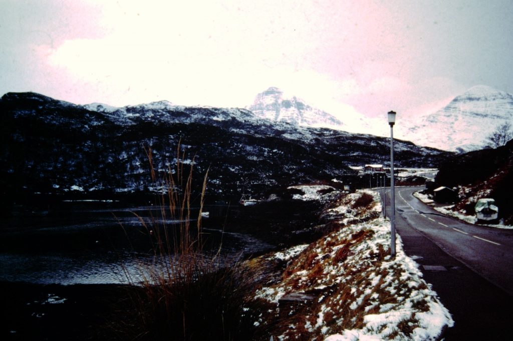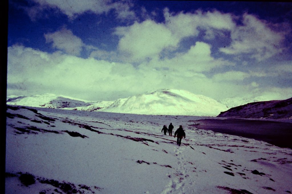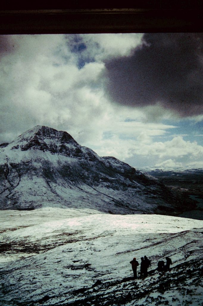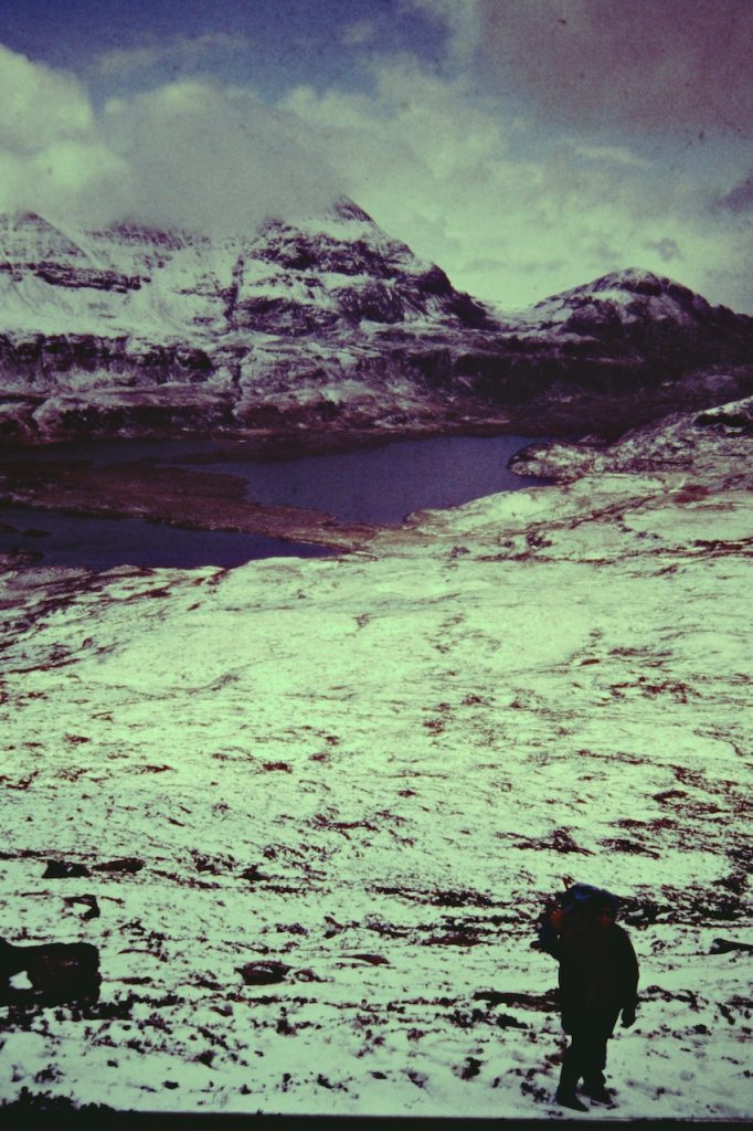 Another image I have of this trip was “bleakness”. There were snow squalls and rain spells throughout the week. Betsy doesn’t entirely agree that it was all that bad, but it was cold and although there were some good days and some successes (Ben Klibreck for instance) there were also some miserable ones. My impression of bleakness might have been caused by the photos which were all very dark. Also this could have been the film and processing – my ancient cheap slide scanner doesn’t help too. Anyway, I have tried to brighten them up for this story. Having complained a lot I can say that as always we loved it, discomforts included!
