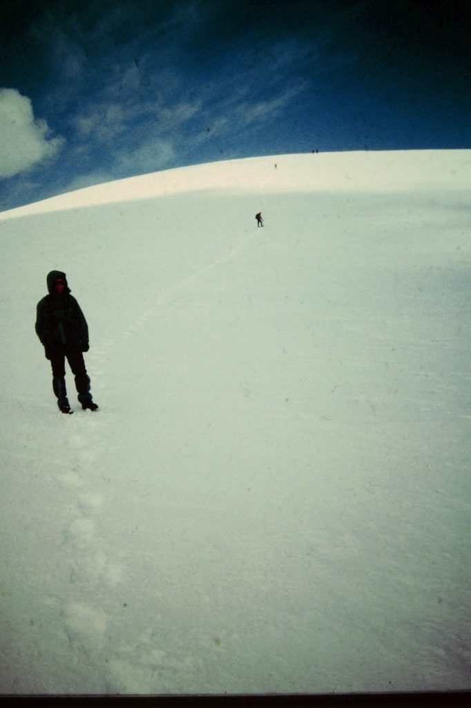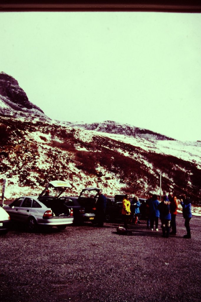 I think that the Ben Klibreck hike was on the last day, but I could be wrong. This is one of the most remote Munros so we made a point of going there. For some reason I ended up breaking trail through moderately deep snow and enduring torturous post-holing to lead everybody. Dave Wharton seemed to chuckle about this because he said that I was “the hero of the White Mountain 4000 footers”. The descent and walk out were memorable for the crossing of a swamp and then struggling to get across a stream by balancing on a rickety wire fence. We started and finished at the Crask Inn. This was the day on which Richard’s car broke down think…