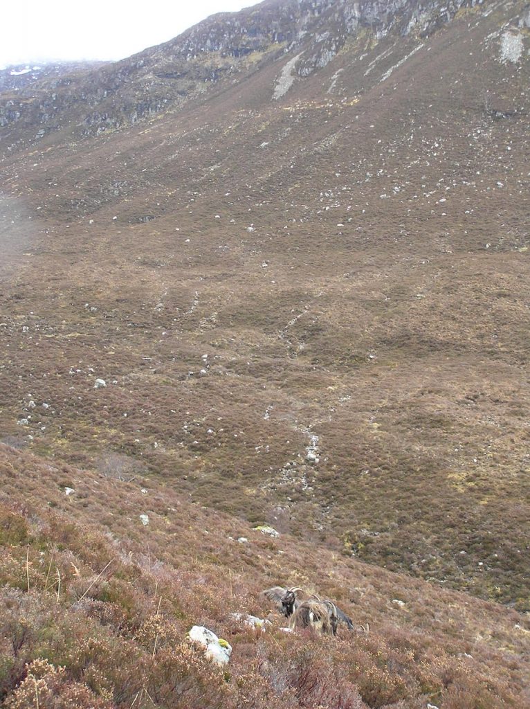 Tuesday 18 April was a Munro-bagging day. We drove to the Ullapool Road for a climb on Eididh nan Clach Geala. The weather was pleasant at the start for a walk along a logging road through forest. Many primroses were blooming. and we saw a number of feral goats. They were even in the road as we drove to the start of the walk.