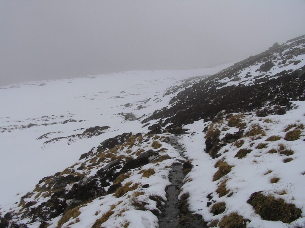Having completed two Munros, Clive, Di, Betsy and Gordon concluded that the best thing was retreat because we were all tired. Phil took Clive and Lynn up the peak that Betsy and I had climbed on Tuesday and the rest of us followed a “short cut” suggested by Phil. There’s not much to say about this other than it was far from short and quite hard with a lot of post holing through wet and soft deep snow. A slog in other words. In retrospect, we would have been better if we had bagged the Muro for a second time!