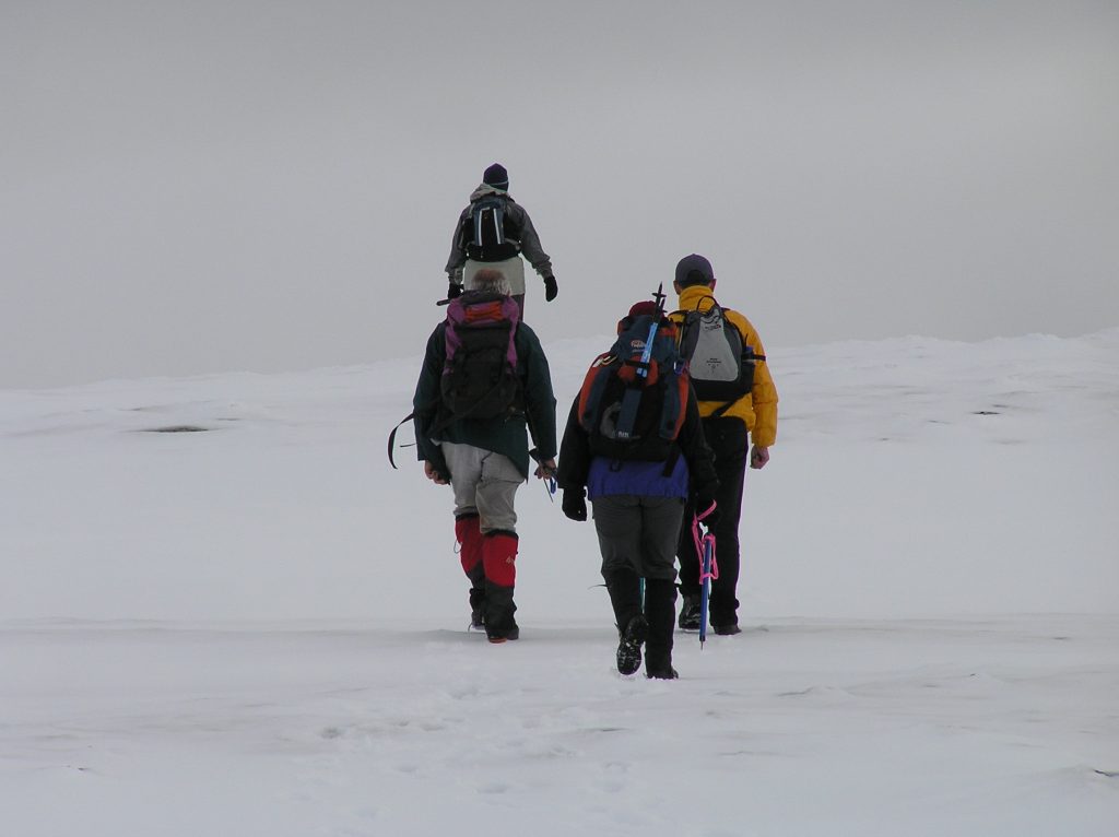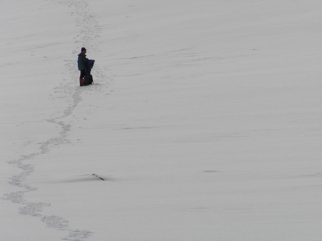 The clouds lowered so hat we could no longer see the peaks above us or our destination. Lunch was had near a trail junction during a snow squall.