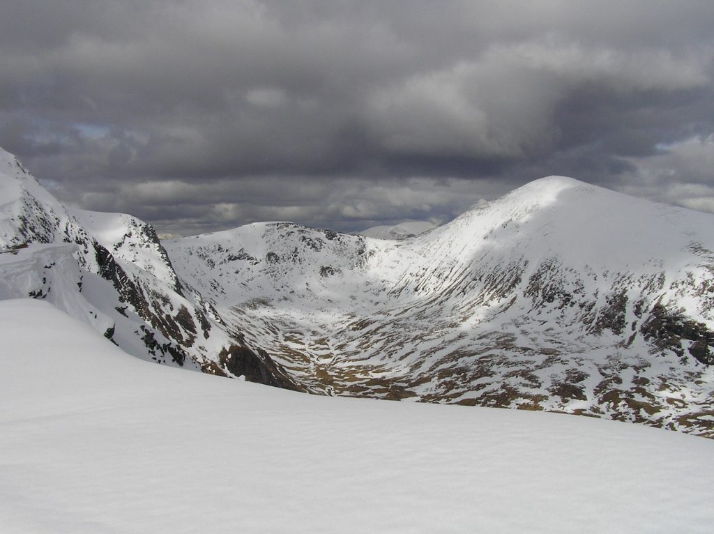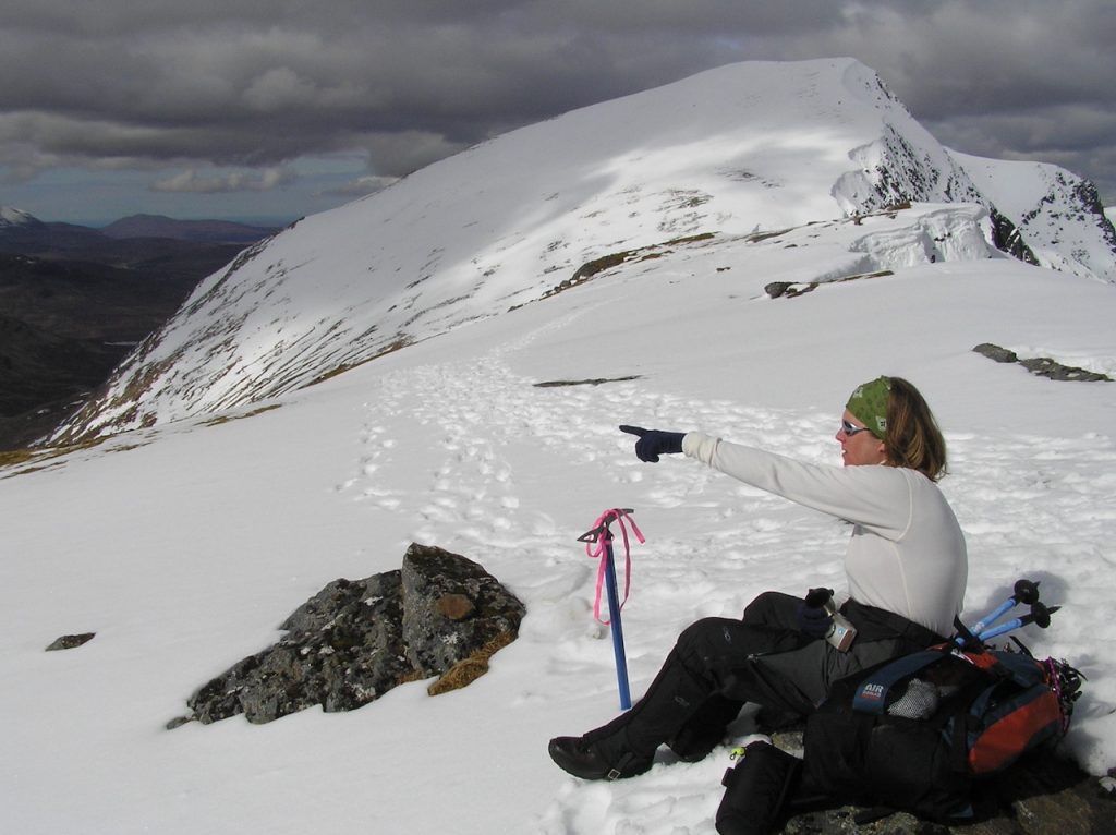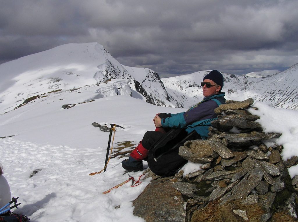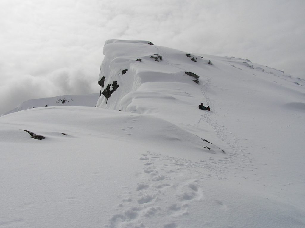 The initial ascent was steep initially on to the ridge, followed be a gentle walk up to the first snowless summit. Dave disturbed a pair of black grouse and Betsy found a feather which she kept as a souvenir. Ice axes came out for the second summit with opportunities for dramatic photos. There was an alpine-worthy cornice that we avoided carefully.