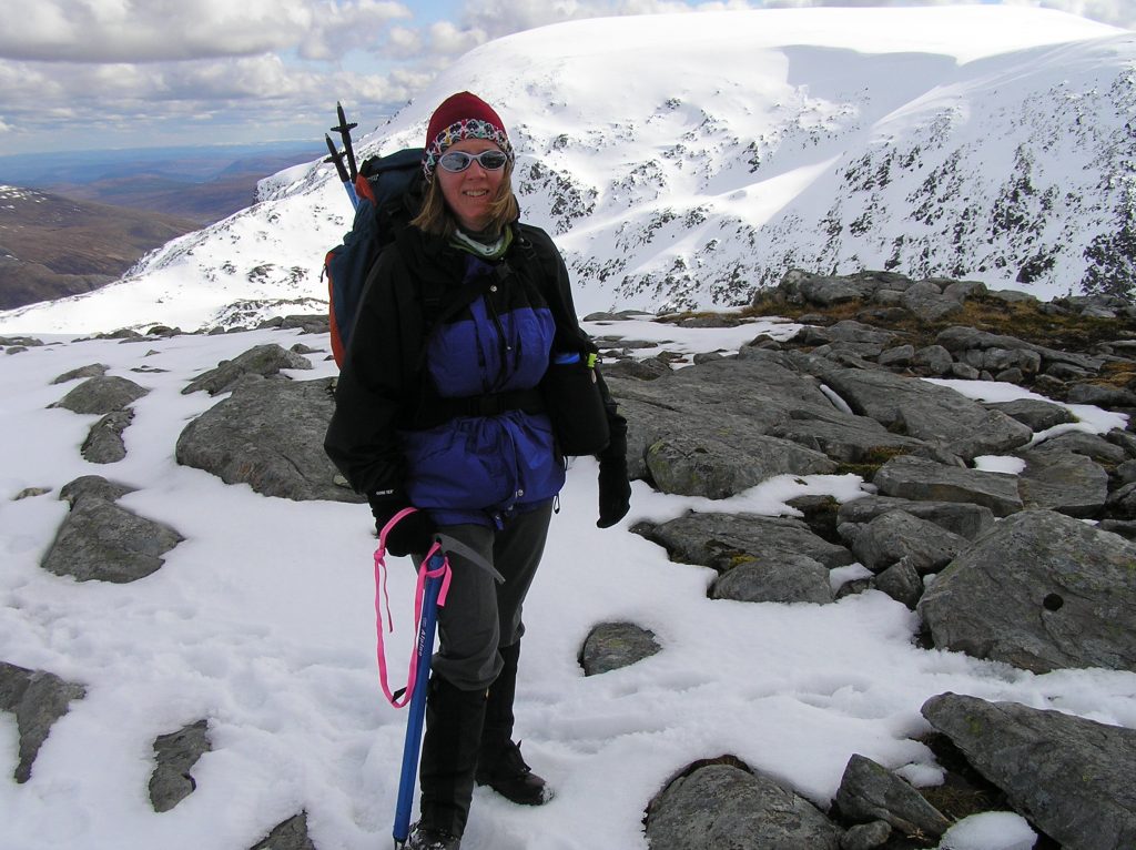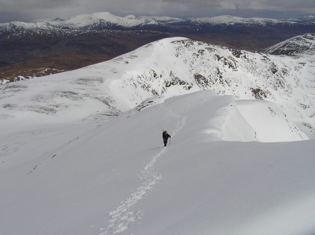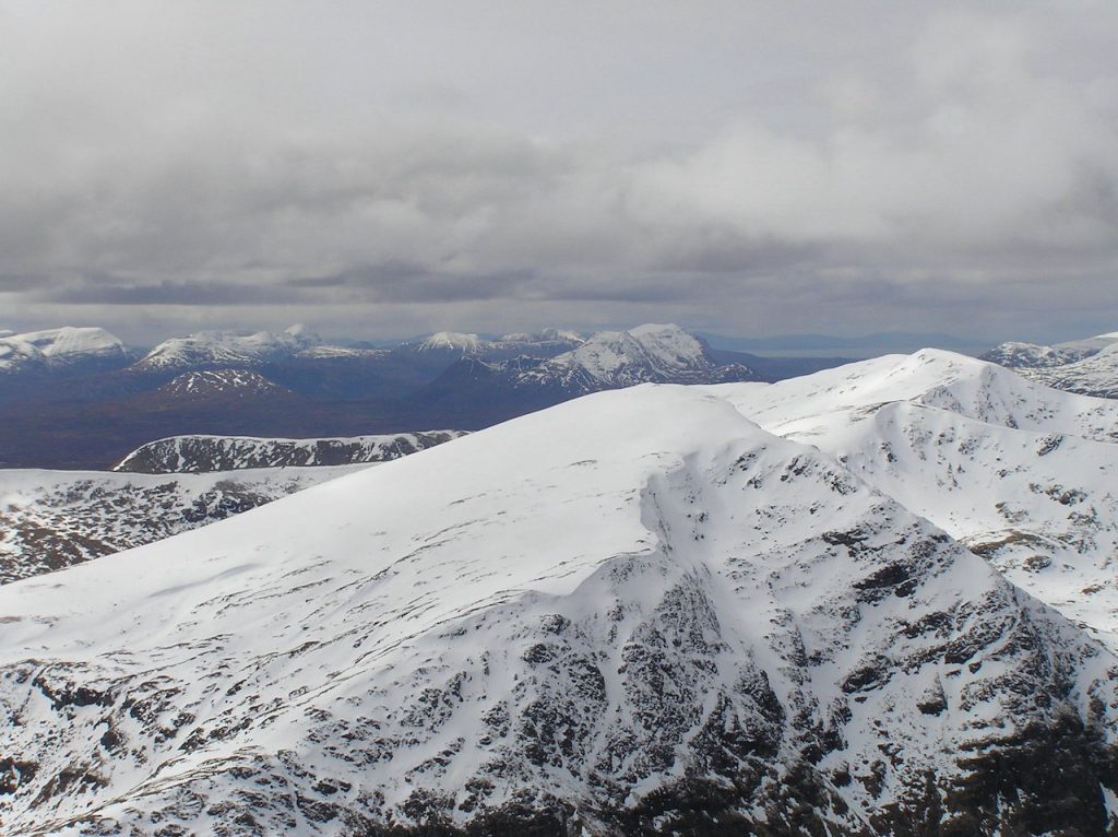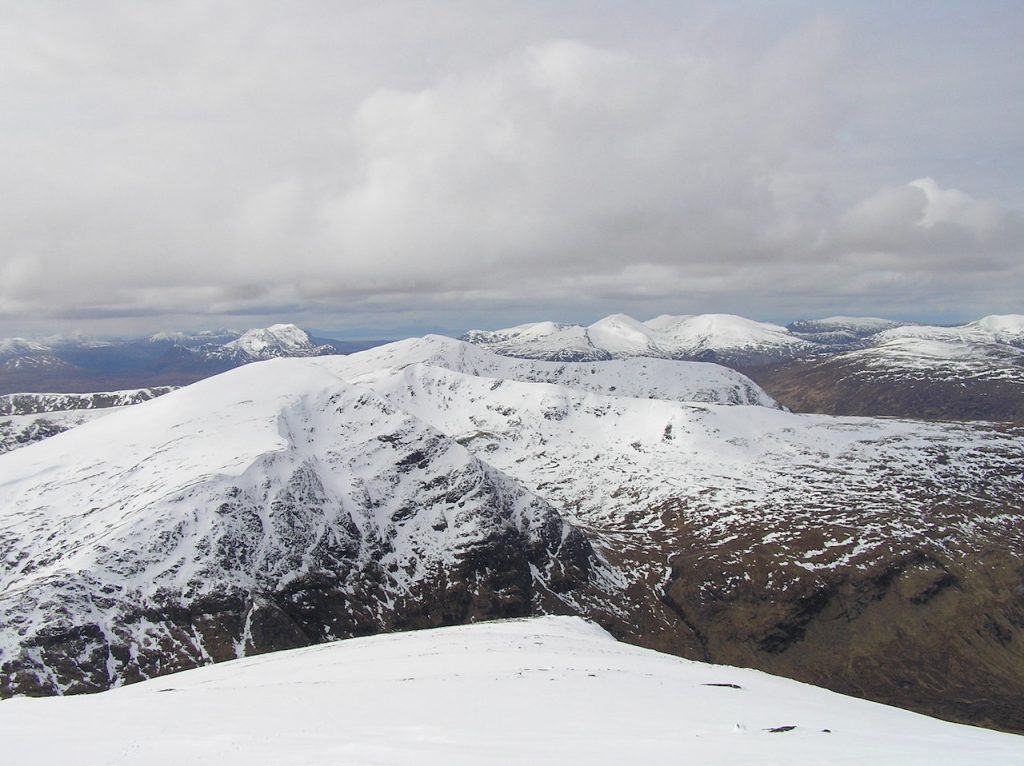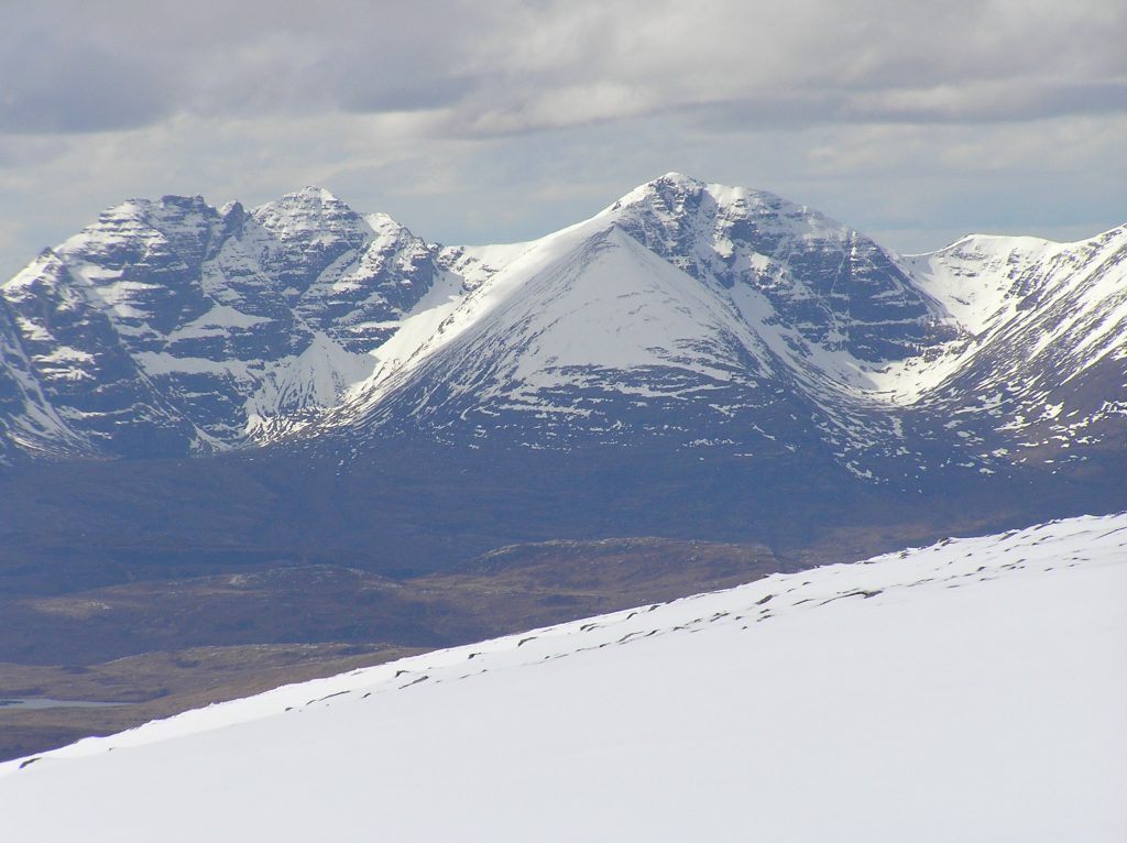 Thursday was a banner day. Despite misgivings about Betsy’s ankle and Gordon being concerned about his weak left knee we packed our rucksacks. Dave Wharton led us on a walk to the Fannichs. 3 Munros is glorious sunshine. Snow everywhere and splendid views with An Teallach dominating everything.