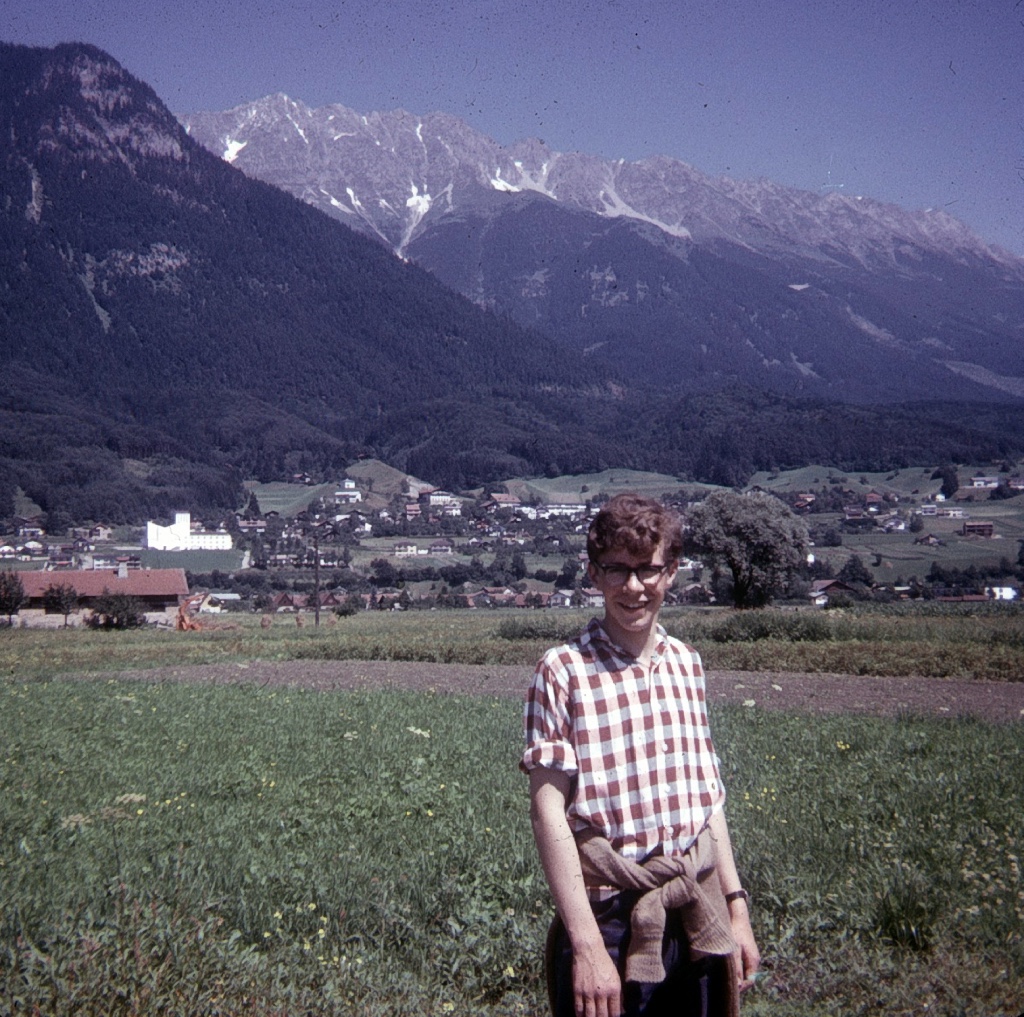 The excursion started with a bus ride to the ferry from England to France. This was on a “Yelloway” bus, I can remember as much as that. It was a big disappointment because the dramatic way to get there would have been on the “Golden Arrow” train from London which involved sleeper cars and a change of wheels to go from the British to the Continental gauge railways. Anyway it was fun I think. Somehow I believe that we took the night ferry from Folkestone to Boulogne. The next stage was a night train to Basel just over the border from France in Switzerland; we might have had couchettes, but I cannot recall much other than occasionally being able to see the French countryside as we passed. There we took a train to Innsbruck. My mother had a theory that European trains has wooden seats and were slow and uncomfortable. Definitely true in this case, but this was a daytime journey with plenty to see out of the window.